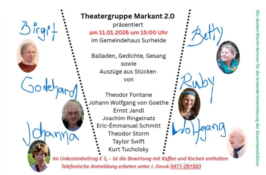 Unsere Theatergruppe möchte sich gerne mit einem interessanten Programm im Gemeindehaus vorstellen. Seien Sie gespannt, wenn bei Kaffee und Kuchen Balladen, Gedichte und Gesang vorgetragen werden. ...