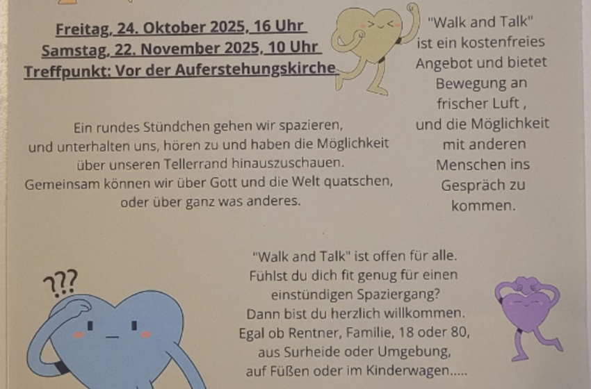 "Walk and Talk" oder spazieren gehen und schnaken. Der Bürgerverein lädt ein, in Gemeinschaft eine Runde zu laufen und in Bewegung zu bleiben oder zu kommen. Aktuelle Termine finden Sie immer ...