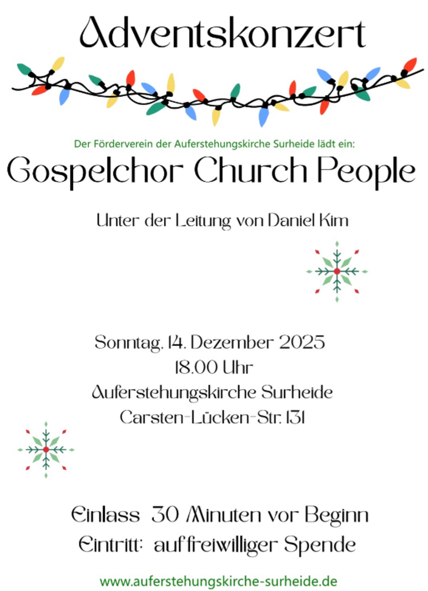 Zum Abschied im Sommer sagte ein Mitglied der Church People, unsere Kirche wäre fast wie ein zweites Zuhause. Es war ein tolles Konzert im Sommer. Um so mehr freuen wir uns, dass wir nun auch wieder in der Adventszeit in Surheide in des Genuss eines Konzertes kommen. Auch dieses mal wird für das leibliche Wohl gesorgt sein. Freuen wir uns also auf einen unvergesslichen Abend.