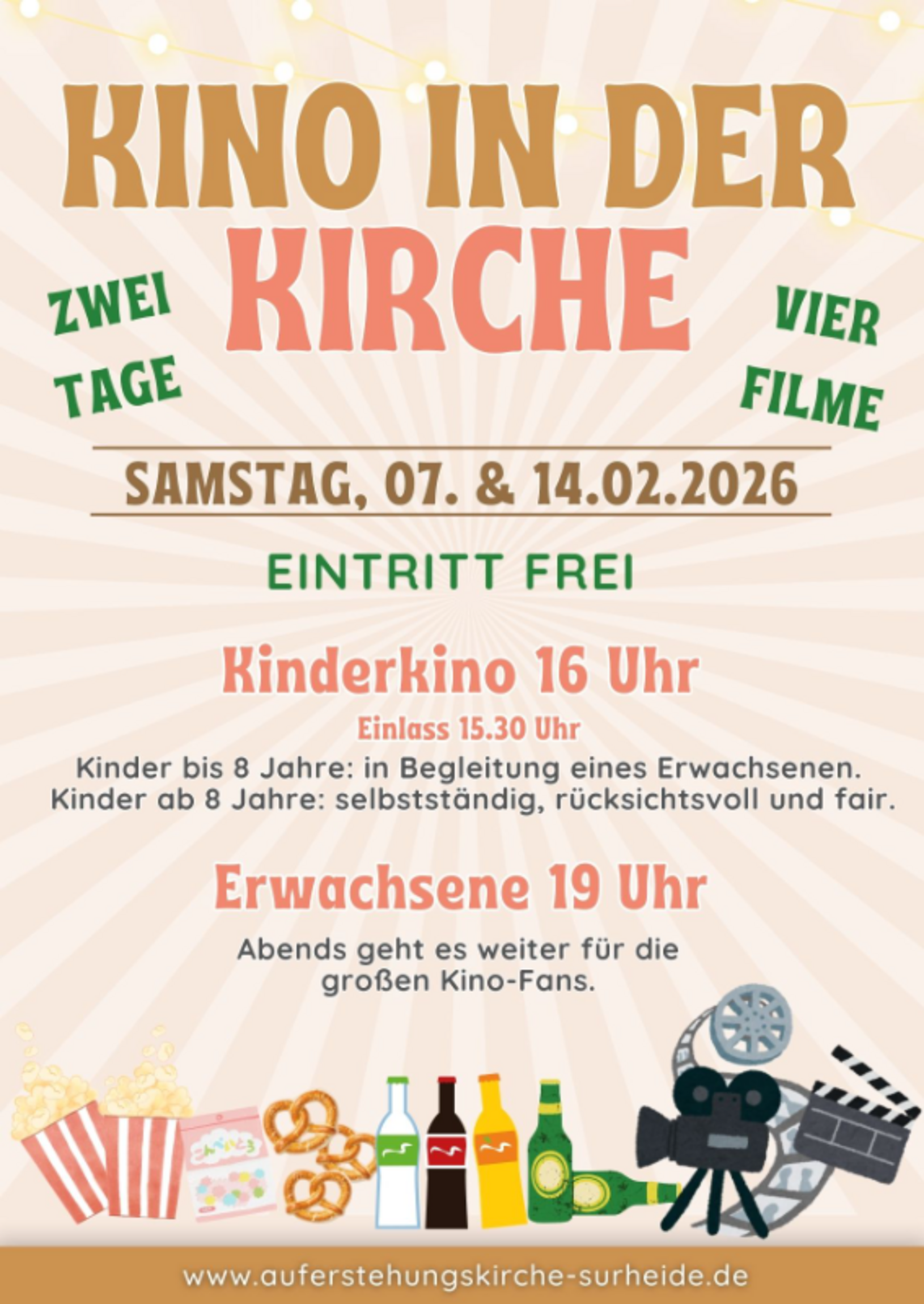 Kino in der Kirche geht in die nächste Runde! Aufgrund der großen Nachfrage freuen wir uns, das besondere Kinoerlebnis dieses Mal an zwei aufeinanderfolgenden Wochen anbieten zu können. Freuen Sie sich wieder auf spannende Filmabende in einzigartiger Atmosphäre, inklusive Getränken und Snacks. Unser herzliches Dankeschön gilt erneut dem engagierten Helferteam der Gemeinde.
