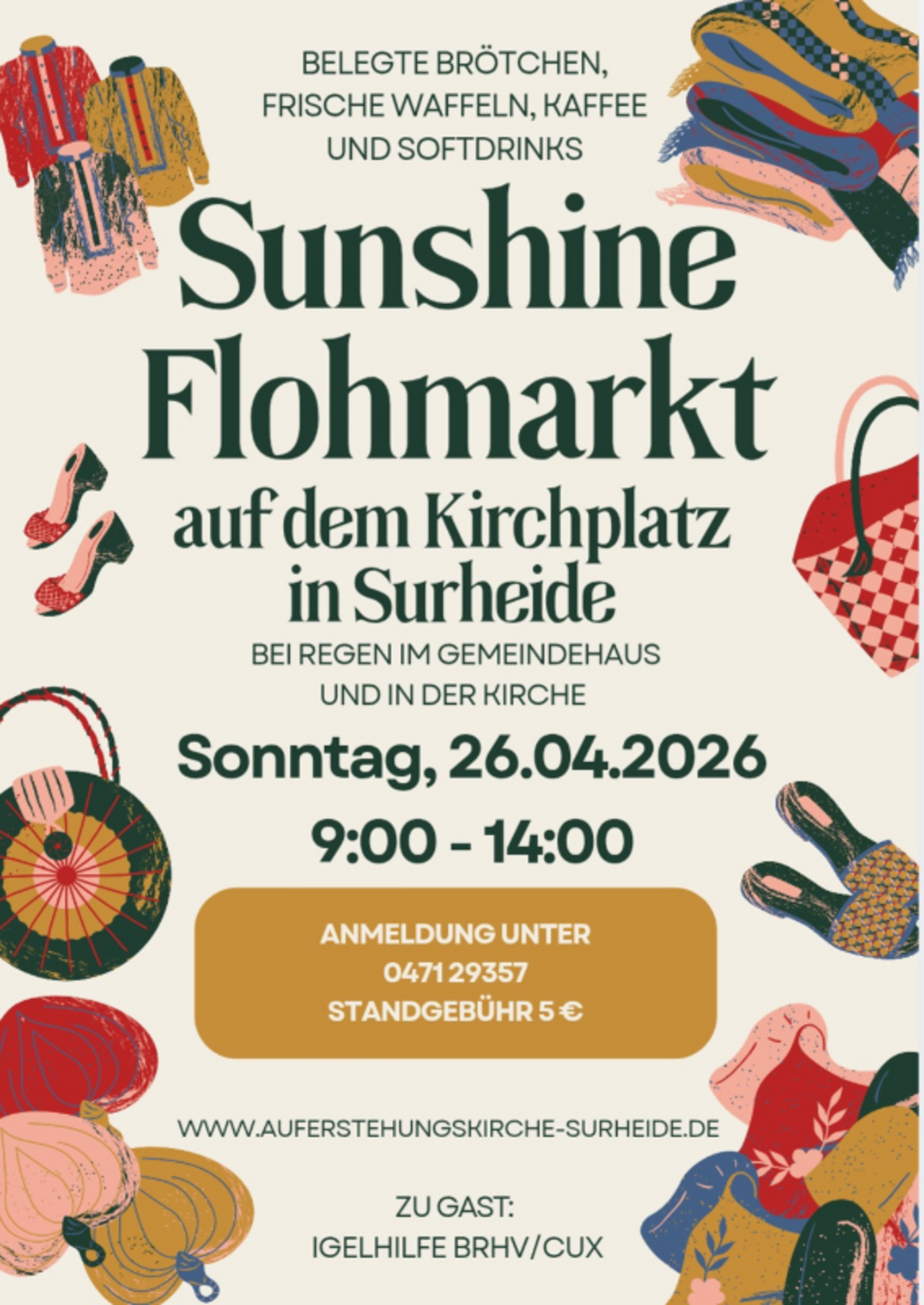 Auch im Frühjahr ist wieder Flohmarktzeit rund um die Kirche. Bei schlechtem Wetter gehen wir kurzfristig in die Kirche und in das Gemeindehaus. Für das leibliche Wohl ist gesorgt.