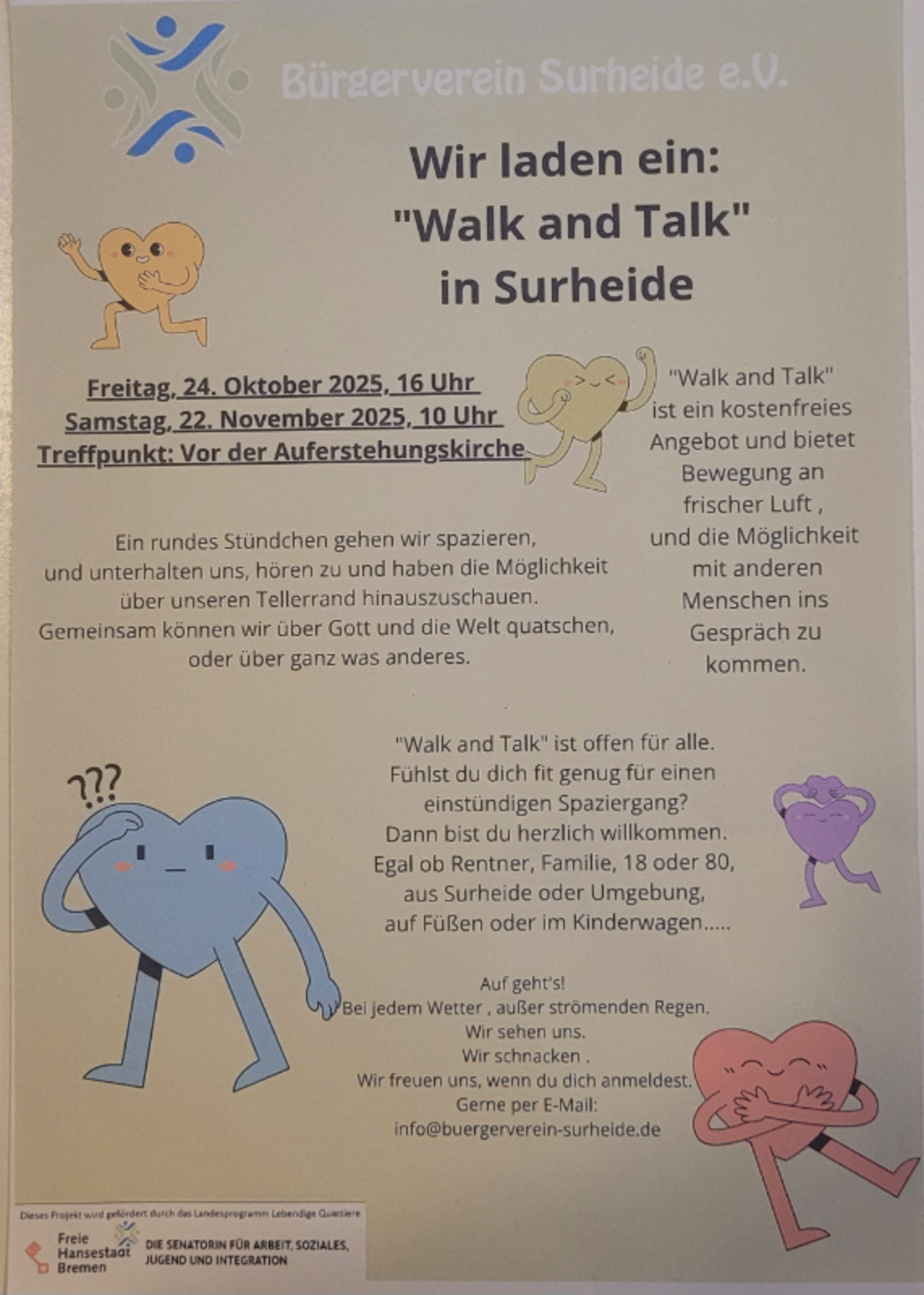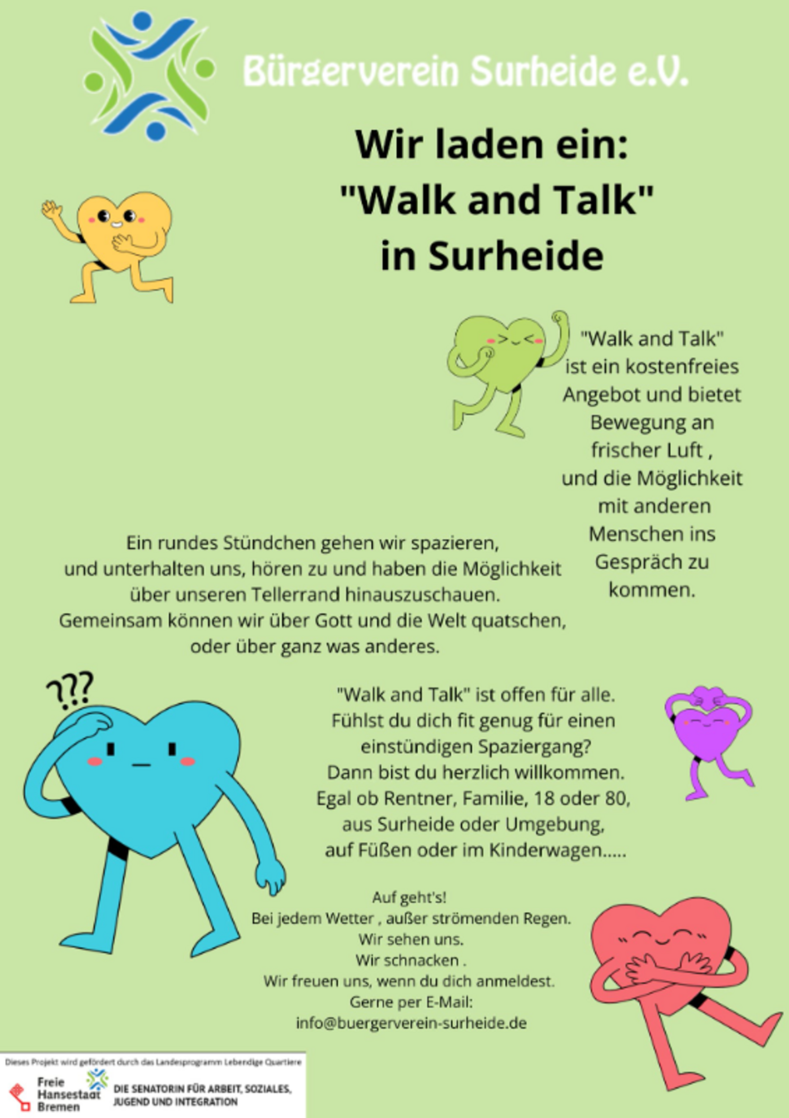 "Walk and Talk" oder spazieren gehen und schnaken. Der Bürgerverein lädt ein, in Gemeinschaft eine Runde zu laufen und in Bewegung zu bleiben oder zu kommen.