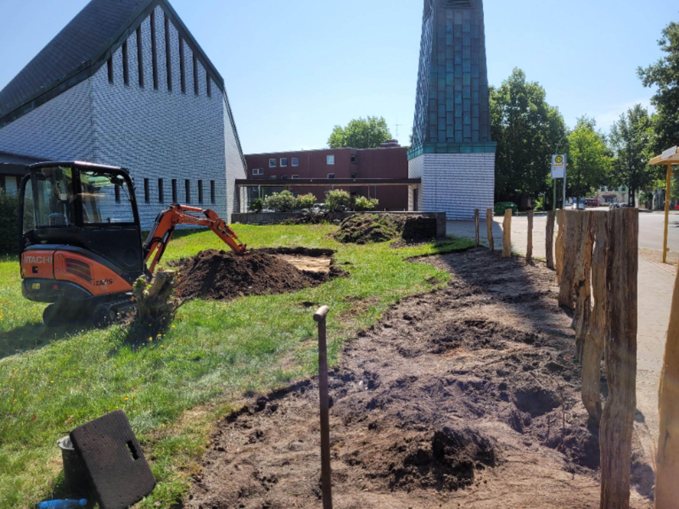 (23.06.25) Nun werden die Veränderungen auf der ehemaligen Wiese immer sichtbarer. Die Eichenpfähle sind gesetzt, hier soll jetzt ein Staketenzaun angebracht werden. In der Mitte wurde mit Hilfe eines Baggers ein großer Bereich ausgehoben. Nein, es wird kein Blumenbeet und auch kein Teich - hier entsteht ein Sandarium. Dies ist ein besonders angelegter Lebensraum für Insekten, die im Boden leben. Erdbienen zum Beispiel nisten zu 75 % im Erdreich.