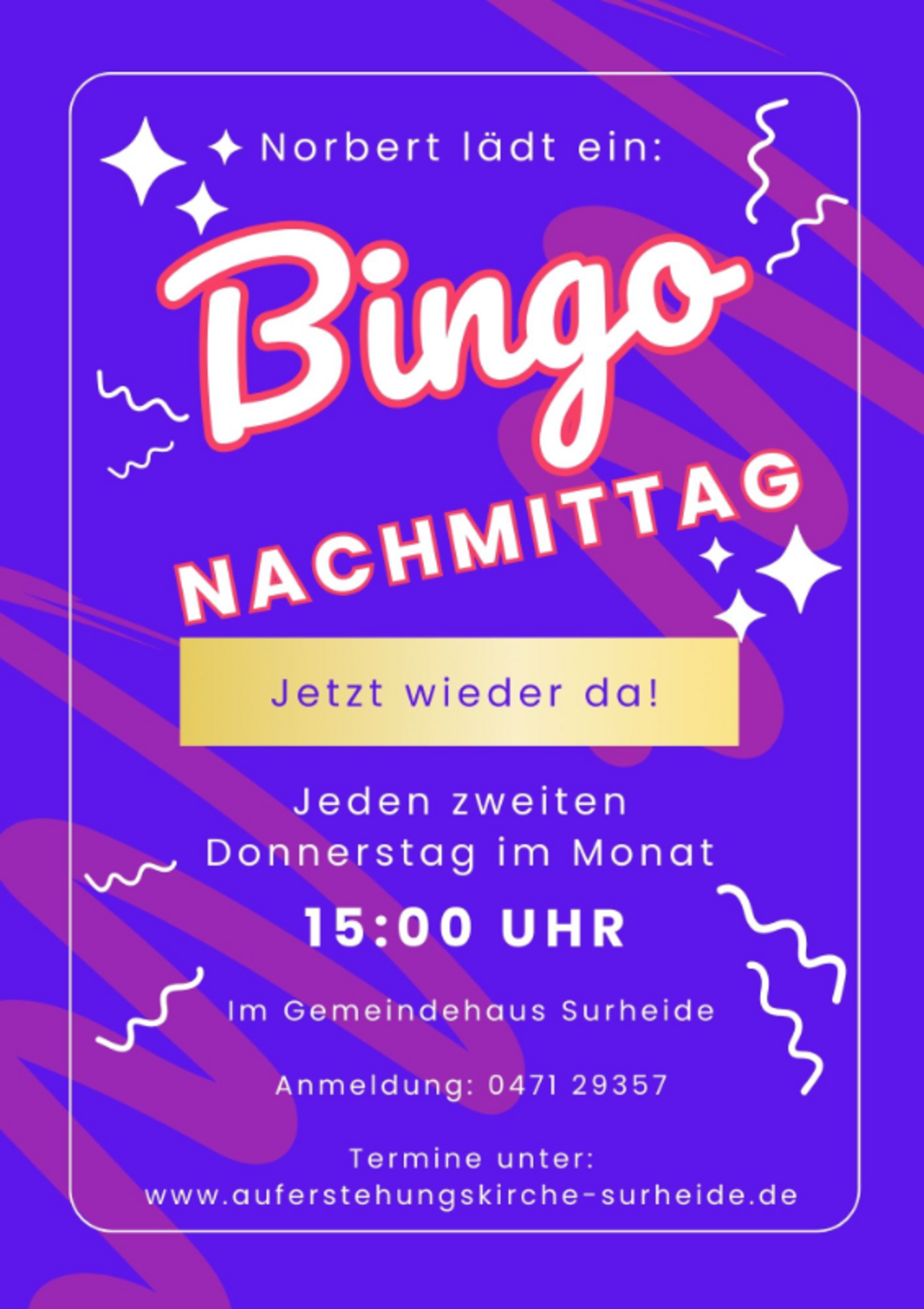 Auf vielfachen Wunsch ist Bingo zurück. Wir laden alle ein, die Lust haben Bingo zu spielen. Bitte Anmeldung bei Norbert.