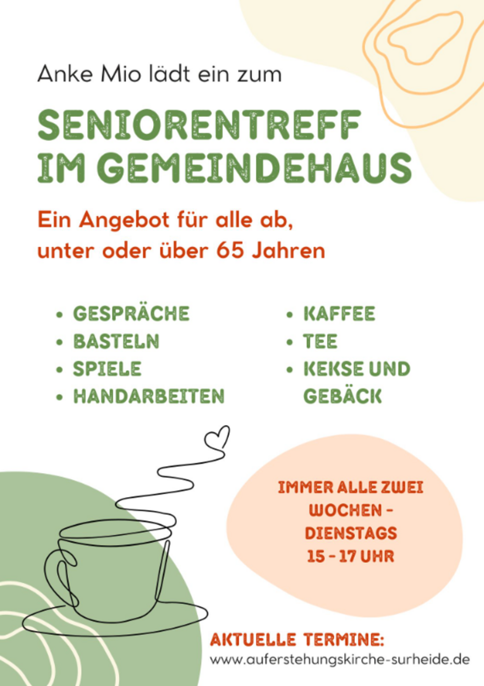 Ab dem 17. Februar gibt es im Gemeindehaus einen neuen, offenen Seniorentreff für alle ab 65 Jahren – jüngere Interessierte sind ebenfalls herzlich willkommen, ganz unabhängig von Konfession oder Kirchenbindung. Der Treff findet alle zwei Wochen dienstags von 15 bis 17 Uhr statt und bietet in gemütlicher Atmosphäre bei Kaffee, Tee und Keksen die Möglichkeit, ins Gespräch zu kommen, gemeinsam zu basteln, Gesellschaftsspiele zu spielen oder Handarbeiten nachzugehen. Ziel ist es, einen Ort der Begegnung und des Austauschs zu schaffen, an dem sich jede und jeder wohlfühlen kann – zum Reden, Lachen, kreativ sein oder einfach zum Dabeisein. Kommen Sie vorbei, bringen Sie gerne Freunde oder Nachbarn mit und genießen Sie einen schönen Nachmittag. Wir freuen uns auf viele neue und bekannte Gesichter!