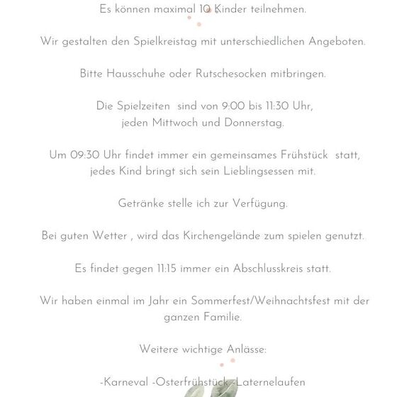 Die Spielzeiten sind von 9:00 bis 11:30 Uhr jeden Mittwoch und Donnerstag im Gemeindehaus. Um 09:30 Uhr findet immer ein gemeinsames Frühstück statt, jedes Kind bringt sich sein Lieblingsessen mit. Getränke und Kaffee für die Eltern stelle ich zur Verfügung. Bei gutem Wetter wird das Kirchengelände zum Spielen genutzt, bald auch mit neuen Spielgeräten. Es findet gegen 11:15 immer ein Abschlusskreis statt.