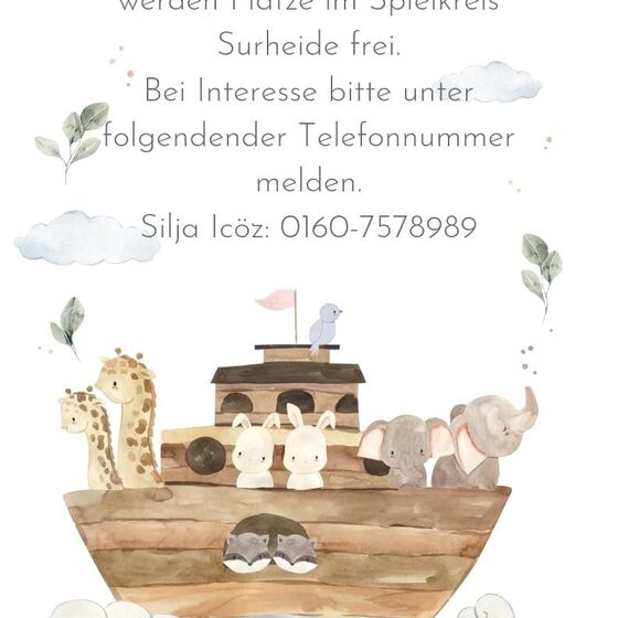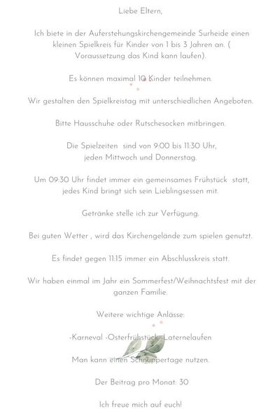 Ich biete in der Auferstehungskirchengemeinde Surheide einen kleinen Spielkreis für Kinder von 1 bis 3 Jahren an. Es können maximal 10 bis 13 Kinder teilnehmen. Wir gestalten den Spielkreistag mit unterschiedlichen Angeboten.