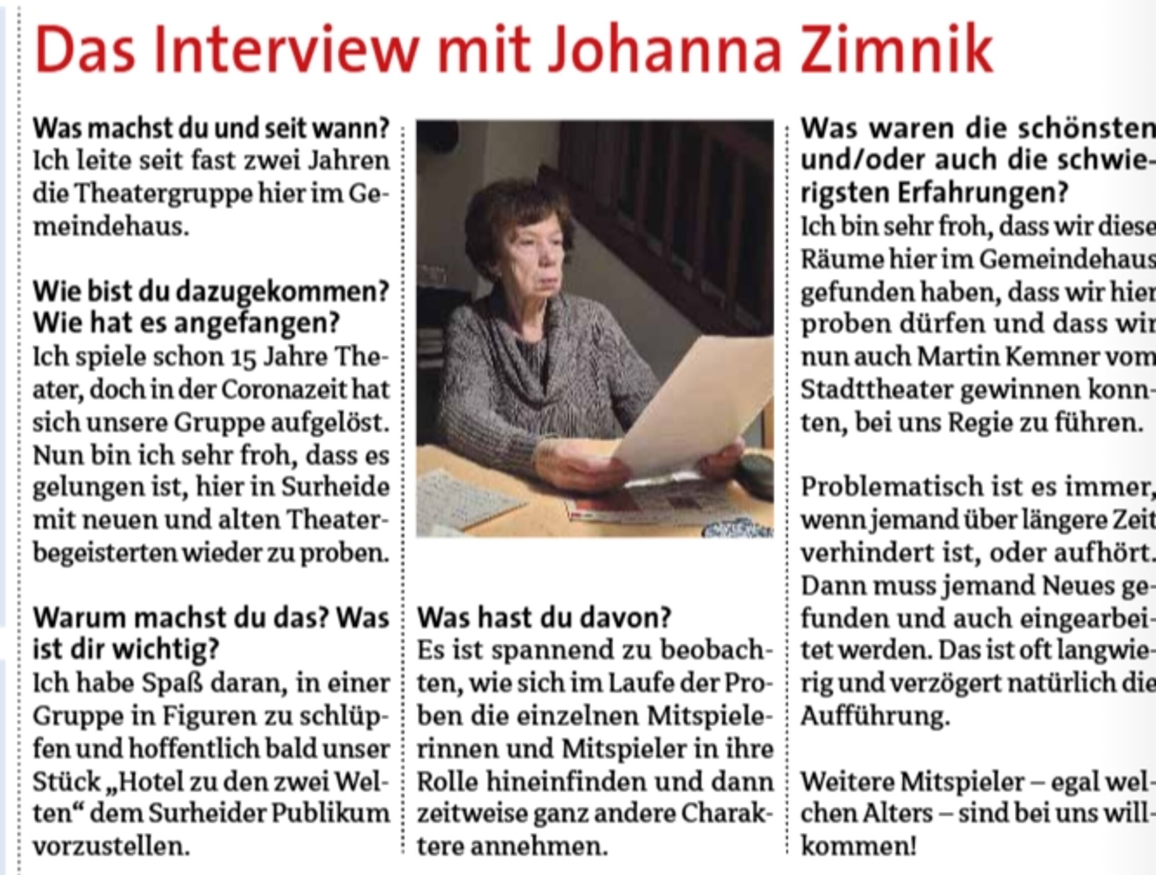 Ich leite seit zwei Jahren die Theatergruppe hier im Gemeindehaus, wir proben zurzeit das Stück" Hotel zu den zwei Welten"
