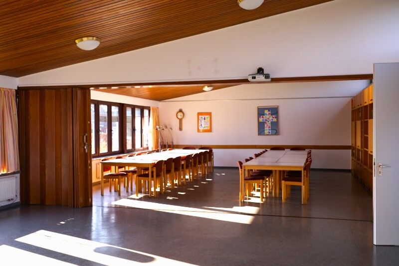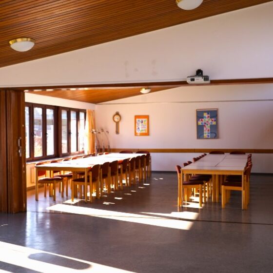 Der Saal im Gemeindehaus kann auch für private Feierlichkeiten gemietet werden. Wir haben einen großen Saal, der mit einer Schiebetür in Saal 1 und Saal 2 geteilt werden kann. Für einen ersten Termin-Check lohnt sich der Blick in unseren Kalender. Sollte der gewünschte Termin frei sein, nehmen Sie gerne Kontakt mit uns auf. Wir besprechen dann alles Weitere.
