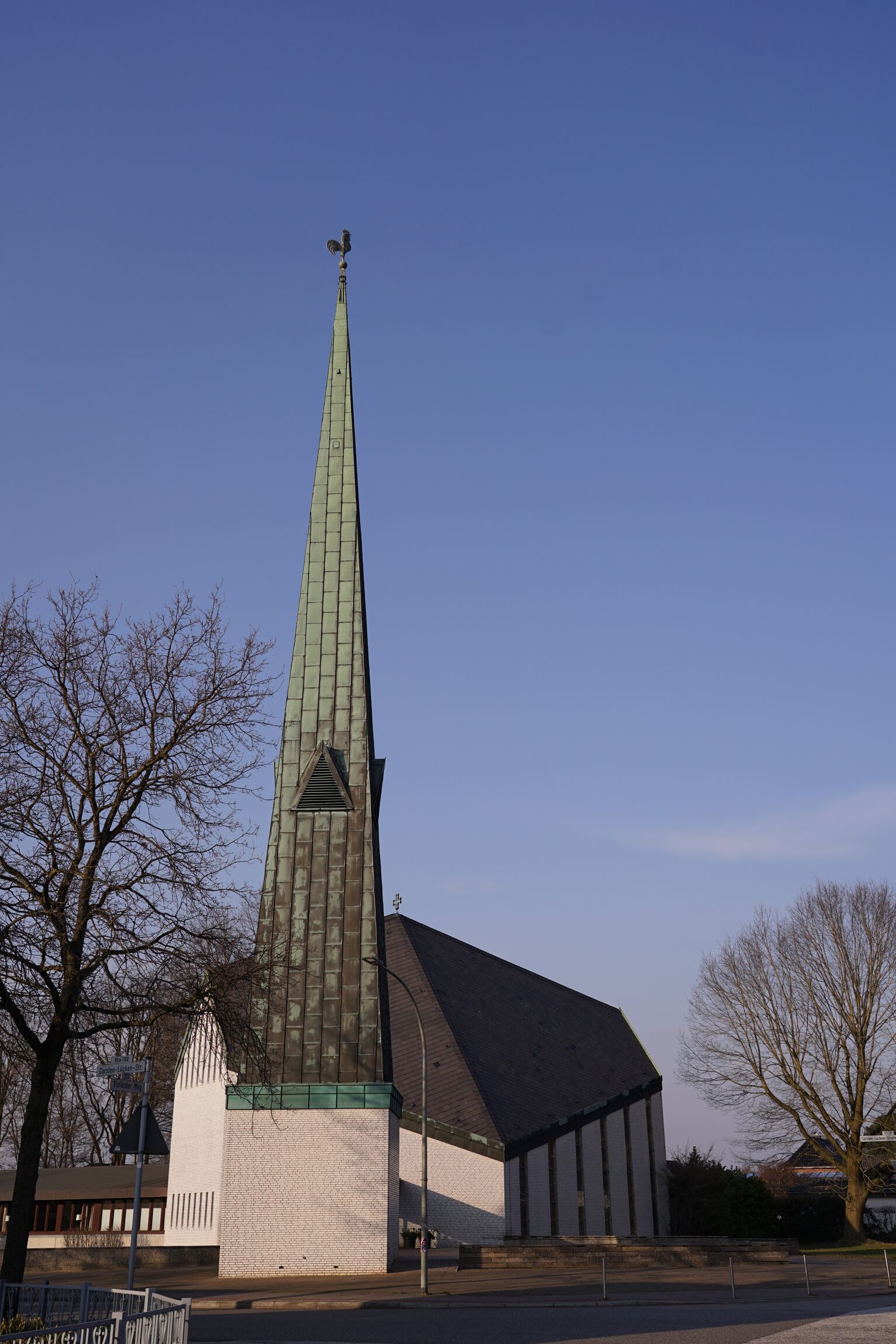 Er ist nämlich 43 m hoch und zeigt wie ein spitzer Pfeil in den Himmel ! Im Turm hängen drei große Glocken, die immer läuten, wenn Gottesdienst in der Kirche gefeiert wird.