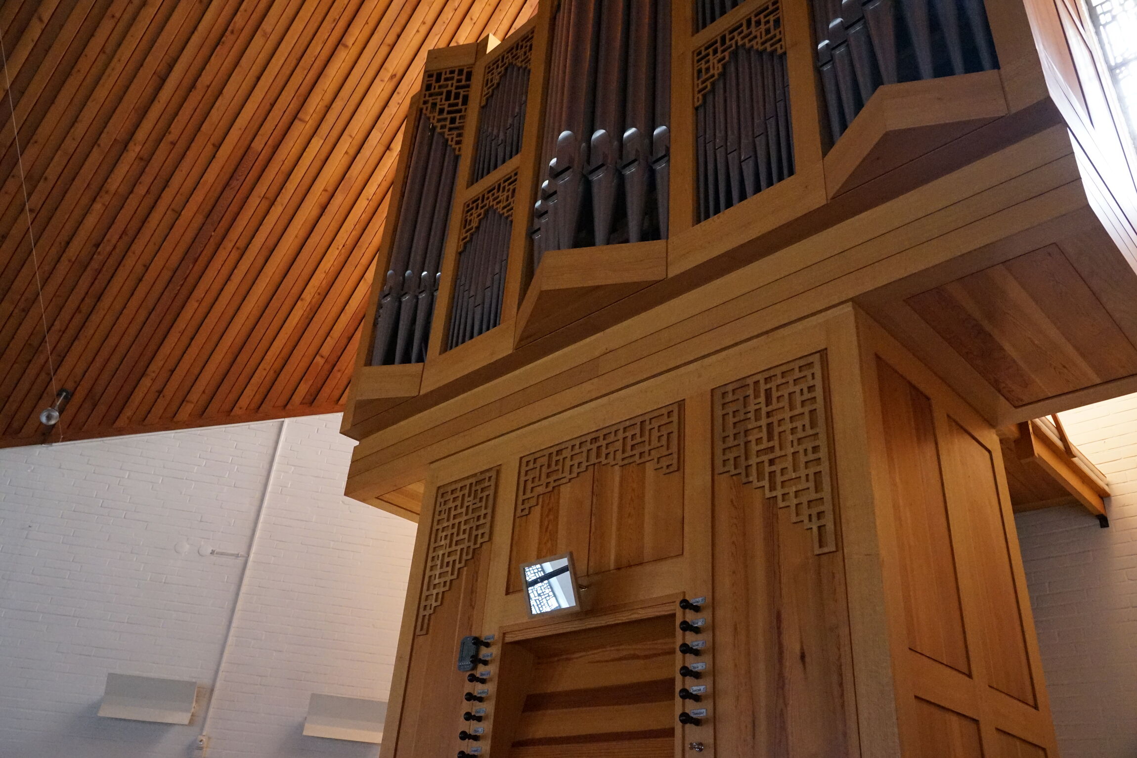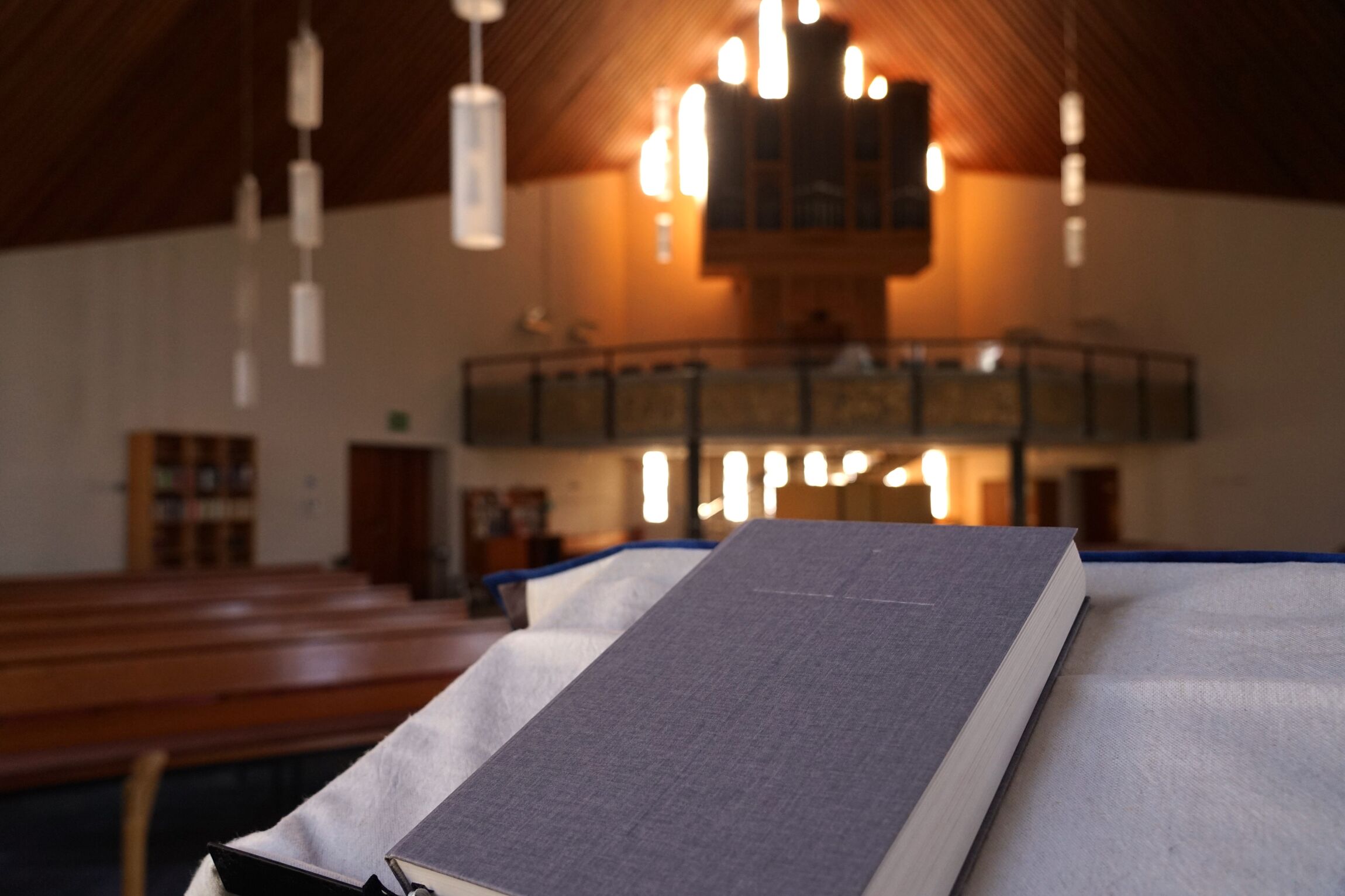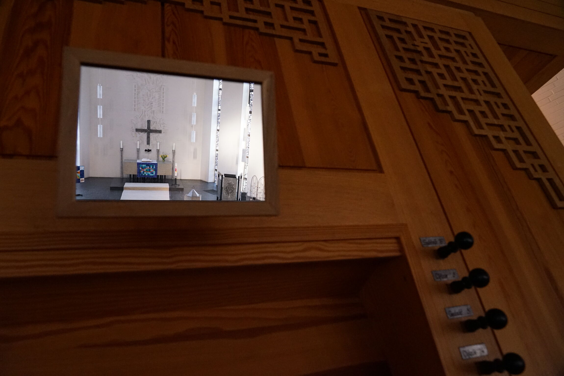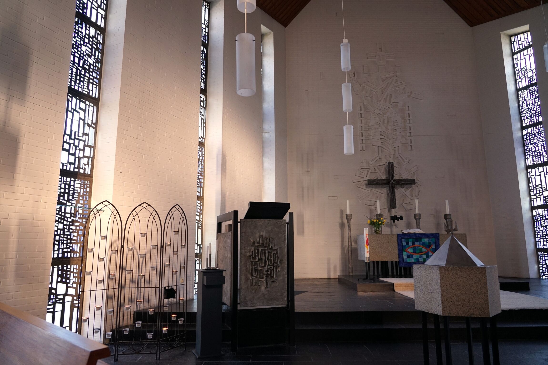 Dann ist da noch unser Altar zu sehen. Der steht auf 31 Beinen. Was das wohl bedeuten soll? Jedenfalls steht vor dem Altar im Gottesdienst der Pastor, wenn er mit und für die Gemeinde betet.